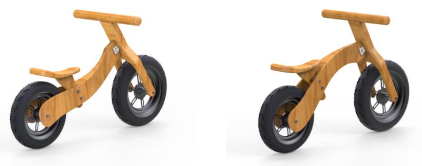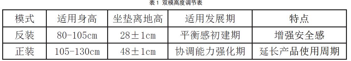 骶骨支撑曲面座垫,坐面压力分布优化,避免坐骨神经压迫,尾端 8°上扬设计兼具挡泥功能。匹配 ASD 儿童反应延迟特性,设计15°机械限位转向角,降低侧翻风险,实现安全转向。车架榉木构件通过防松脱法兰螺母连接,设计双模高度调节,通过横梁的反装低重心模式(如图4)和正装高重心模式(如图5)实现坐高大幅度调节,搭配座垫升降微调节设计,适配3-6 岁儿童身高范围(如表1)。