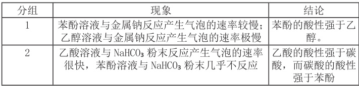 组 2 :分别取等体积、等浓度的苯酚溶液和乙酸溶液于两支试管中,向两支试管中同时加入等量的 NaHC03 粉末,观察并比较两支试管中产生气泡的速率和产生气体的量。