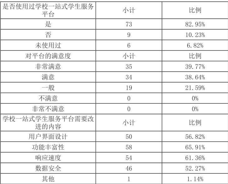 高校一站式学生管理服务平台的使用率达 82.95% ,其中 绝大部分的学生表示满意,这反映出该平台在一定程度上满足了学生学习和管理需求,为思想政治教育工作提供了辅助支持。但仍有部分学生认为平台一般或未使用过平台,这可能与平台的宣传推广、功能适配性等因素有关。在平台功能方面,学生认为其在功能丰富性、用户界面设计和响应速度等方面有待改进。高校应加强对数字化平台的宣传推广,提高学生知晓率和使用率,同时组织专业技术人员对平台进行全面评估和优化,增加与思想政治教育相关的模块,如在线测试、案例分析、互动讨论等,使用户界面设计更加简洁明了,便捷高效,优化响应速度以提高平台使用体验,并根据学生反馈及时调整和改进平台功能,提高平台的稳定性和可靠性,从而更好地满足学生需求,提升思想政治教育工作的效果。