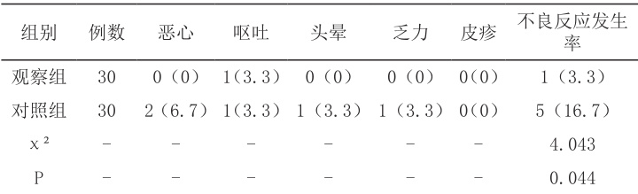 观察组药物不良反应发生率低于对照组,差异有统计学意义( (P<0.05) )。具体数据见表2。