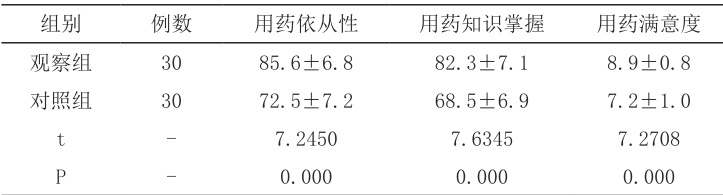 用药体验质量:采用用药体验质量综合评定问卷(GQOL-74)对患者干预前后的用药质量进行评估,该问卷包括用药依从性、用药知识掌握、用药满意度3 个维度,每个维度得分越高表示用药体验质量越好。