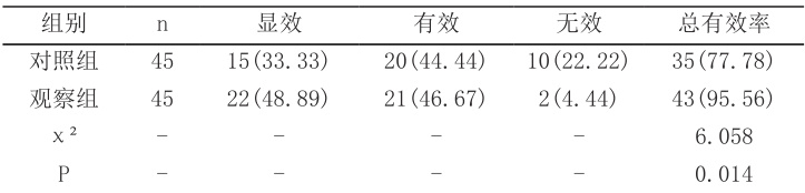 观察组总有效率为95.56%,高于对照组的77.78%,差异有统计学意义 (P<0.05) ,见表1。