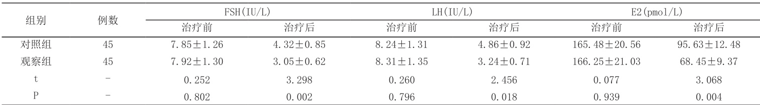 2.2 两组治疗前后卵巢功能比较治疗前,两组 FSH、LH、E2 水平比较,差异无统计学意义 (P>0.05) 。治疗后,两组 FSH、LH、E2 水平均低于治疗前,且观察组FSH、LH、E2 水平均低于对照组,差异有统计学意义 (P<0 .05),见表2。