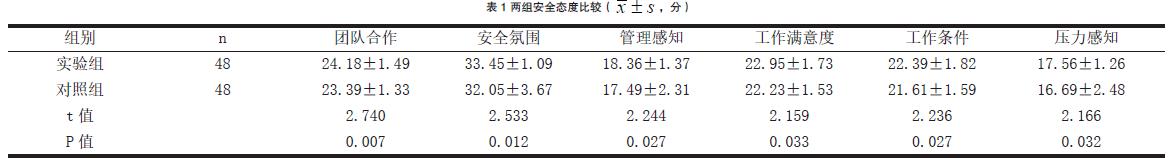 实验组 C-SAQ 中的团队合作、安全氛围、管理感知、工作满意、工作条件、压力感知的评分均明显高于对照组,两组间的比较差异具有统计学意义 (P<0.05) 。见表1。