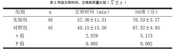 实验组交班时间明显短于对照组,NASR 评分明显高于对照组,两组间的比较差异具有统计学意义(P < 0.05)。见表 2。