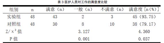 实验组医护人员对工作的满意度明显高于对照组,两组间的比较差异具有统计学意义(P < 0.05)。见表3。