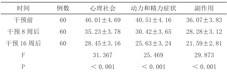 患者开展医疗体操活动后的心理社会、动力和精力症状和副作用各个维度生活质量评分均低于开展前,且开展16 周后的各个维度生活质量评分低于开展8 周后的评分 (P<0.05) 。详见表2。