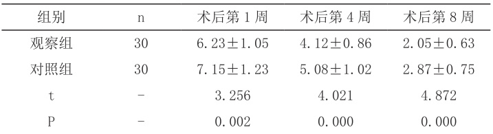 术后第 1 周、第 4 周、第 8 周,观察组 VAS 评分均低于对照组,差异有统计学意义 (P⟨0.05) ),详见表1。