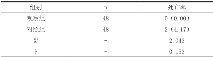 观察组死亡率 0.00% 比对照组4. 17% 更低,但组间对比未见显著差异 (P>0.05) ),见表1。表 1 组间死亡率对比 [n(%)]