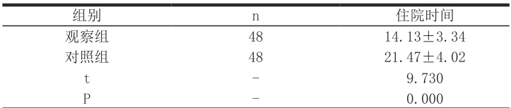 组间住院时间对比,观察组比对照组更短 (P⟨0.05) ),见表3。