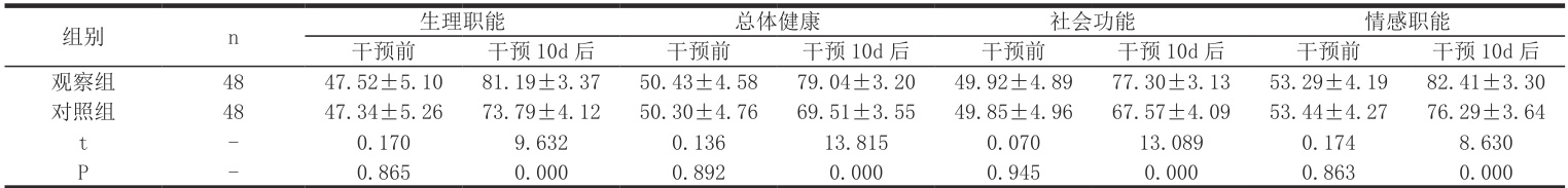 组间干预前生活质量比较未见差异 (P)0.05) );组间干预 10d 后生活质量对比,观察组更优 (P⟨0.05) ),见表4。