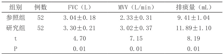 研究组患者 FVC、MVV 指标水平均高于参照组,气道湿化期间排痰量大于参照组( ⋅P⟨0. 05) ),详见表1。