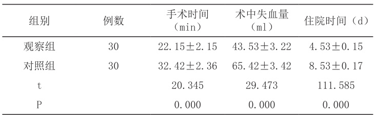 观察组术中失血量少于对照组,术后恢复时间及住院时间相比对照组更短,P<0.05 ,如表1。
