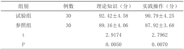 试验组理论知识及实际操作成绩与参照组比较均更高, P<0.05 ,计算有差异,见表1。