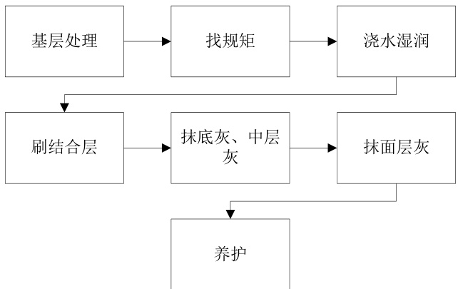 此外,为优化顶棚抹灰表面的质感效果,可借助扫帚实施拉毛处理工艺,旨在形成结构化纹理模式,显著提升防滑属性及美学表现。抹灰作业完毕后,须在涂层干燥程度达到约60% 阶段,采用纸巾擦拭石膏层面进行品质评估。若观察到颜色过浅现象,需即刻应用湿润养护方式维护抹灰层,从而优化施工质量。顶棚抹灰施工工艺流程图如图1 所示。