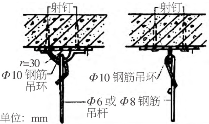 针对预制楼板缺乏预埋件的施工状况,可采用射钉技术实施处理,完成后再对膨胀螺栓位置实施精测,保障后续维护流程顺畅。如图 2 所示,利用射钉方式将 200mm×200mm× 6mm钢板固定于吊筋定位点,于钢板中心焊接 Φ10mm 钢筋吊环,并调整该吊环半径至 30mm,随后将φ6mm 或φ8mm 吊杆经由吊环与顶墙连接固定。