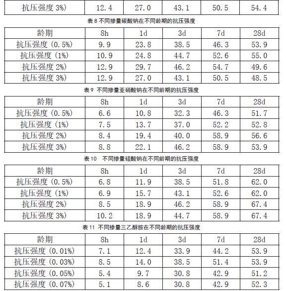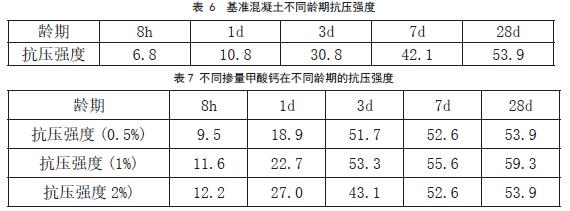 基准混凝土各龄期抗压强度见表6,掺不同早强剂在各龄期抗压强度见表7、表8、表9、表10、表11。