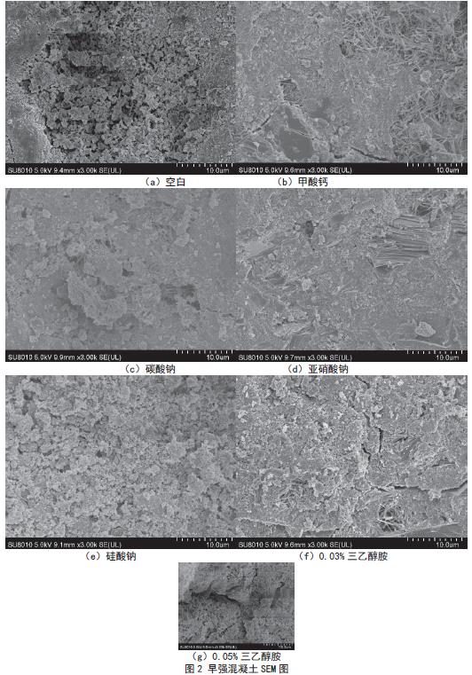 为进一步分析早强剂对混凝土水化的影响机理,分别将掺加不同早强剂的混凝土试件在标准环境下养护1d,并对其进行SEM分析,具体如图2所示。