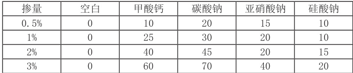 ,这种凝胶具有一定的保水增稠作用,在一定程度上抵消了其促凝作用带来的流动性损失,因此其对坍落度的影响在试验掺量范围内小于甲酸钙和碳酸钠。