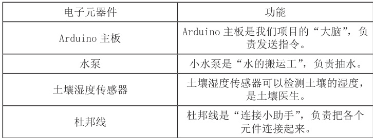 通过查找资料获得了绿植的生长条件,此时教师引导学生思考:在这些条件因素中,哪一个是我们最难控制的因素,并且一旦出现问题会直接影响绿植的生长?这为第一个探究环节。学生进行思考,自然得出水分控制是绿植最容易出现问题的地方。在第一个探究环节中让学生认识到人工浇水的弊端,为引出新技术劳动工具—智能控制系统做铺垫。学生尝试思考使用新技术工具,这为第二个探究环节,此时教师趁热打铁展示智能绿植养护的控制设备,教师引导学生思考智能控制设备的工作原理:Arduino 主板接收到土壤湿度传感器的值,进行判断后控制水泵是否浇水。第二个探究环节学生了解到各电子元器件的工作原理和功能。这里有助于学生思维能力的培养,持续激发学生的学习动机。如表2 所示。