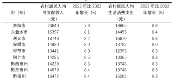 在讲授假设检验和方差分析(ANOVA)时,选用了《贵州省 2023 年各市(州)农村常住居民家庭人均年收入与生活支出》数据(见表1)。例如,数据显示: