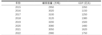 在讲解回归分析时,笔者引用了某省 2015–2022 年碳排放与 GDP 的公开数据(表2 为示例数据)