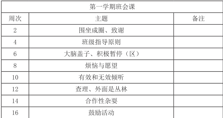 正面管教提供了丰富多样的班会主题,班主任可以根据班级实际情况灵活选用,其灵活性和弹性较大。在班会过程中,学生还能学到许多有助于学业成功的技能,例如发表意见、倾听他人、从不同角度看问题、将错误视为学习机会、发现同伴的优点、理解协作的力量、培养对社会有益的影响力和能力感、因做出贡献而获得成就感等。