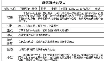 为系统化推进陶艺课程,我们成立了相关的教研团队,团队成员职责明确。从最初的先各自提出相应的实施方案建议到最后拟定的实施方案。有了方案的基础,我们在实施的过程中会遇到困惑,我们会通过集体或分组研讨,持续解决问题。在每一次探讨的过程中我们做好会议记录,并且给组员下发困惑探讨卡,在会议前组员会将自己所开展活动过程中所遇到的困惑进行记录,另外通过研讨我们将解决的方法记录到小结中,最后融入到活动实践验证,如果问题解决了我们就继续实施,如果问题依旧无法解决,那么我们会通过专家引领、外出学习、书籍查阅等方式再次深入探讨,久而久之我们所提出的问题将一一解决。