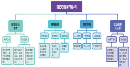 我们的课程架构分为入门陶艺课程、一段陶艺课程和二段陶艺课程。一开始我们按照幼儿年龄段去分课程,如小班陶艺课程、中班陶艺课程等。后来经过一年的实施发现如果孩子从来未接触过陶艺课程,他的前期经验是空白的,而无关年龄,不同年龄段的孩子都可以完成相同主题的作品,也许呈现的效果不一,但艺术不就是独一无二的吗?我们课程架构从入门到段位,不同年龄段的孩子都可以使用,我们老师可以通过了解孩子前期经验选用不同阶段的课程开展活动。