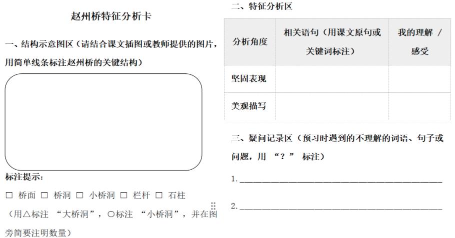支持性学习工具在预习环节的作用,主要体现在帮助学生建立阅读预期、聚焦关键信息、形成初步理解。比如在《赵州桥》一课的教学中,教师可以设计赵州桥特征分析卡作为预习工具。这张工具卡分为三个区域:结构示意图区呈现桥梁的基本构造,特征分析区设置坚固表现和美观描写两个子栏目,疑问记录区留给学生标注不理解的内容。学生在预习时,先观察结构示意图建立直观印象,再带着具体任务阅读课文,用不同颜色标注相关语句。这样的预习工具改变了传统预习的随意性,使学生的阅读活动更有针对性。教师在设计这类工具时要注意:工具提示要具体明确,避免泛泛而谈;要预留学生自主思考的空间,不能变成简单的填空题;工具大小要适中,便于学生携带和使用。