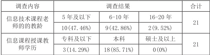 从调查结果中不难发现,21 所学校中有 2 所学校没有配备机房;8 所乡村学校中有 5 所未开设信息技术课程;超过 20% 以上的学校机房不能满足信息技术课程的教学需求;年轻教师占比不足 50%,还有 14.29% 的不具备足够专业知识的专科学历教师;在教材使用上,教学内容难和教材不匹配的情况超过 30%。