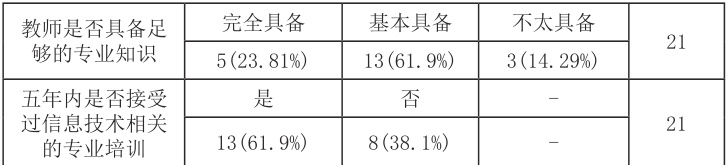 人工智能教育具有很强的实践性,需要相应的硬件设备和实践环境支持。从调研结果可以看出,边疆地区学校存在计算机设备陈旧、网络运行不稳定等问题,难以满足人工智能教育对高性能计算设备和稳定网络环境的需求。(2)人工智能教育师资力量专业化不足,远未达到教师素养要求。
