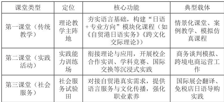 模块化设计:第一课堂设置“自贸港口语实务”、“服务贸易日语”等专业模块;第二课堂开展“日语 + 旅游”等实践项目;第三课堂对接海南国际旅游岛建设需求,实现学用结合。