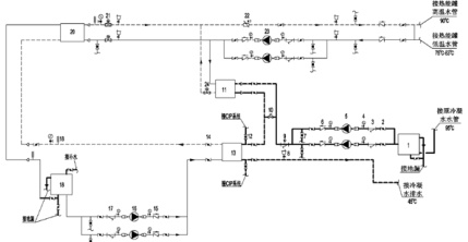 1. 集水箱 2.DN50 蝶阀 3.DN50 过滤器 4. 压力表 5. 二次冷凝水泵 6.DN50 单向阀 7. 排水阀 8. 自动排气阀9. 自清洗过滤装置 10. 气动截止阀 11. 一次换热板换 12. 快接手动蝶阀 13. 二次换热板换 14.DN65 蝶阀15.DN65 单向阀 16. 中间循环水泵 17.DN65 过滤器 18. 中间缓冲水箱 19. 温度计20. 水源热泵机组