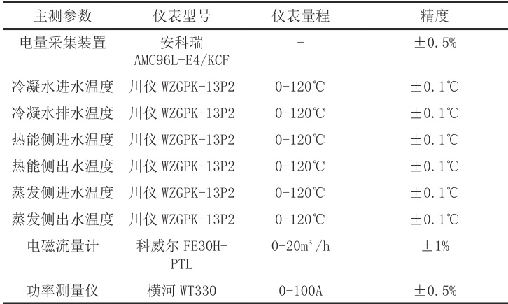 为了确保实验数据的准确性和可靠性,我们选用了高精度的测试仪表。电量采集装置采用的是安科瑞的AMC96L-E4/KCF,该装置能够实时、准确地采集热泵的电能数据,包括电流、电压、功率等参数,测量精度可达 ±0.5% 。水温传感器采用重庆川仪生产的 WZGPK-13P2 铂电阻式温度传感设备,其测量精度为 ±0. .1℃,能够精确测量二次冷凝水、热能水以及各换热环节的水温。电磁流量计选用德国科威尔仪表公司的 FE30H-PTL 型流量表,测量精度为±1%,可实时监测二次冷凝水和热能水的流量变化,确保对系统水流量的精确控制和数据采集。功率测量仪采用日本横河 WT330 功率测量仪,测量精度为 ±0.5% ,能够准确测量热泵机组的功率消耗。各测试仪表的量程和精度如表2 所示: