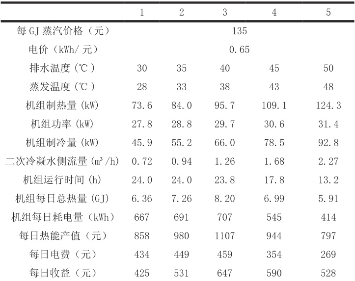 从表 3 中可以清晰地看出,当排水温度为 40℃时,每日收益为 647 元,在所有测试工况中收益最佳;而当排水温度为 30℃时,每日收益仅为 425 元,收益最差。这是因为在40℃排水温度下,机组的性能系数较高,能够以较低的能耗制取更多的热量,同时二次冷凝水侧流量和机组运行时间也处于相对合理的范围,使得余热回收系统的整体经济效益达到最优。但是随着排水温度的进一步升高,系统排水温度达到50℃时,此时机组的性能系数更高,但由于二次冷凝水侧排出流量大幅增加,导致系统的运行时间变短,使得每日总热量有所下降,最终收益不如在排水温度为 40∘C 的工况。综上所述,在本实验条件下,40℃是余热回收经济性最佳的排水温度。