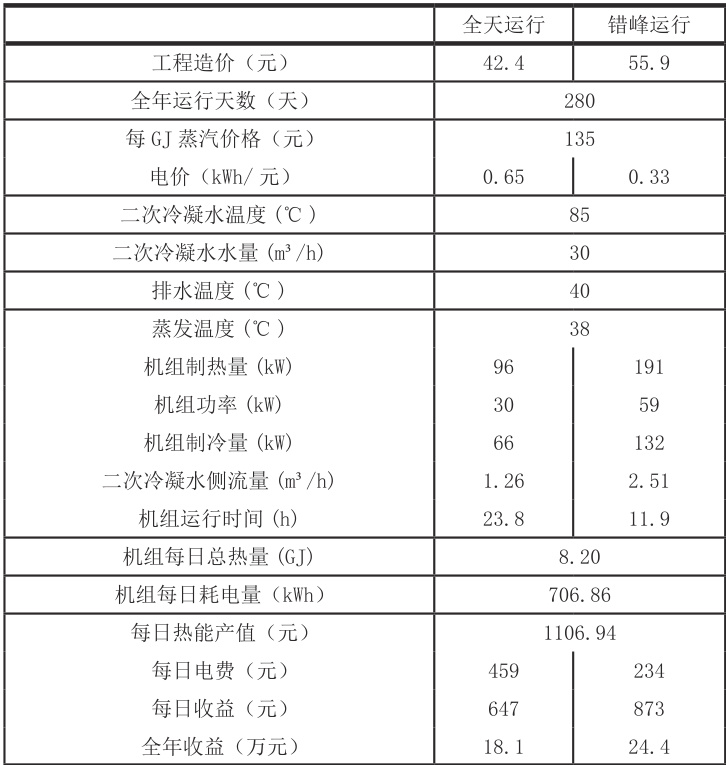 从工程造价来看,全天运行模式下的工程造价为 42.4 万元,而错峰运行模式的工程造价为 55.9 万元。错峰运行模式的工程造价相对较高,这主要是因为错峰运行需要配置更大功率的设备,以满足在谷时段集中处理二次冷凝水的需求,同时还会需要增加一些辅助设备和控制系统,以实现机组的错峰运行。