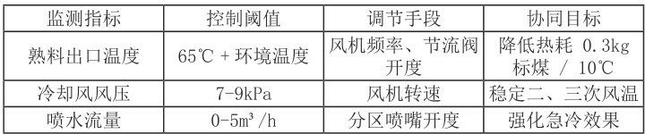 结合改造方案中对冷却风与熟料温度的控制需求,智能温控与喷水组件协同调节可作为辅助手段,进一步优化能效。其核心是通过实时监测熟料温度与冷却风参数,动态调控喷水装置与风机运行,实现热耗最小化。