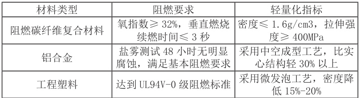 为实现阻燃性与轻量化的协同优化,建立了材料性能矩阵,对不同类型材料的阻燃要求和轻量化指标进行明确规定,如下表所示: