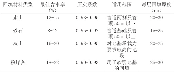 表1 不同沟槽回填材料及夯实度要求