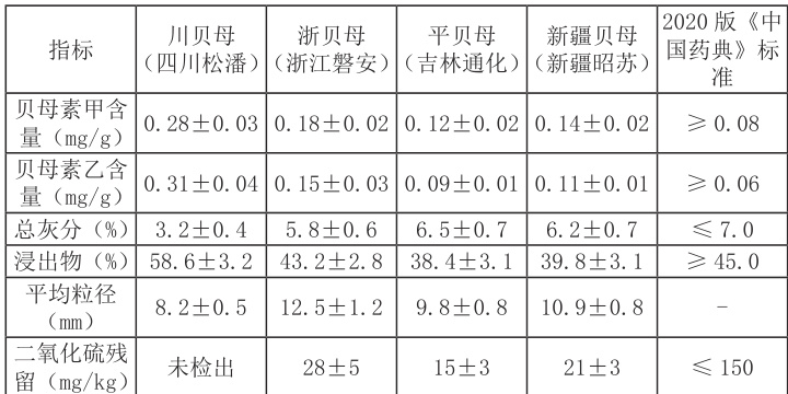 灰分指标:川贝母 (3.2%±0.3) )显著低于浙贝母(5.8%±1.2)平贝母 (7.1%±2.3) (p<0.01) ),提示川贝母炮制过程对无机杂质控制更严格,符合《中药炮制规范》三类药材灰分 ⩽ 4.0% 的优质标准。
