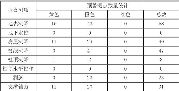 从基坑数据统计结果可知,整个基坑开挖过程中监测数据累计值整体较大,预警监测点位较多,具体预警测点数量统计见下表:
