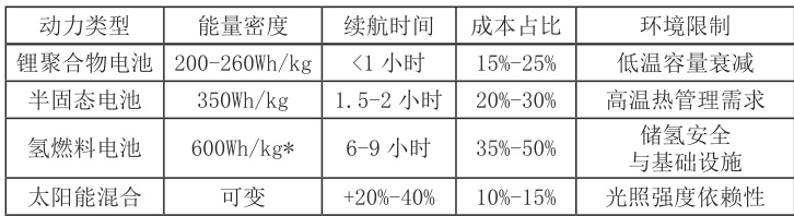 小型固定翼无人机的动力系统正经历从单一能源向多元混合的转型。传统锂电池因能量密度上限和循环寿命短难以满足长航时需求。燃料电池技术虽具潜力,但成本与系统复杂性构成壁垒。国内“青鸥 30”氢动力无人机创下 9 小时续航记录,远超同功率锂电池无人机 3-4 倍,但其最大起飞重量达 30kg ,且高压储氢系统推高了整机造价。太阳能辅助方案通过柔性薄膜电池集成减轻重量,但受限于光电效率与气象依赖性,实际增益仅可提升续航 20%-40% 。