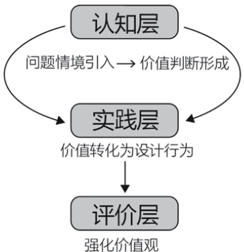 界面设计作为连接技术与用户的桥梁,其伦理决策会直接影响社会公平与数字包容。本路径聚焦于界面设计中“技术决策—用户影响—社会责任”的伦理链条,旨在通过明确设计标准和情境判断,引导学生在项目实践中把“科技向善”的职业伦理意识记在心里。根据课程思政“情境—认知—行为”的递进原则,该路径采用“认知—实践—评价”三层渗透教学模式(见图 1),把抽象价值观转化为具体的界面设计规范,让思政目标自然融入技能训练全过程。