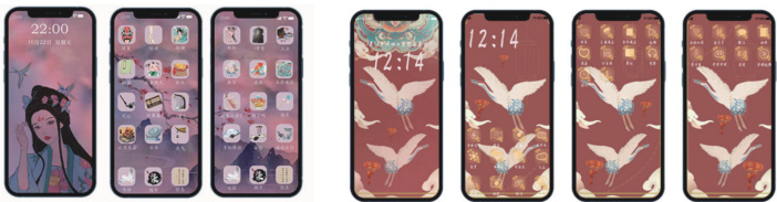 在该路径的教学实践中,部分学生作品成果已初步体现出“视觉语言推动文化传播”的育人成效。例如,《中国风仙鹤》(见图 3)项目将传统的仙鹤与祥云元素系统化为 UI 图标体系,采用中国红与金色配比构建庄重典雅的视觉氛围,体现出对祥瑞文化符号的深入解读。其主屏界面设计将云纹与折扇图样组合,融合剪影式构图方式,使整体界面兼具文化意蕴与审美现代性。又如,《淡妆淡抹总相宜》(见图 3)作品以山水画与仕女图为母题,构建富有诗意的视觉场景,并将古典器物(如香炉、团扇、玉佩)作为图标基础单元,结合柔性色卡系统与宋代线描风格,使界面呈现出文人气质与东方审美的统一。这些作品不仅在形式上实现“传统 + 数字”的融合,也在表达层面体现出文化再构与价值传达的可能性。