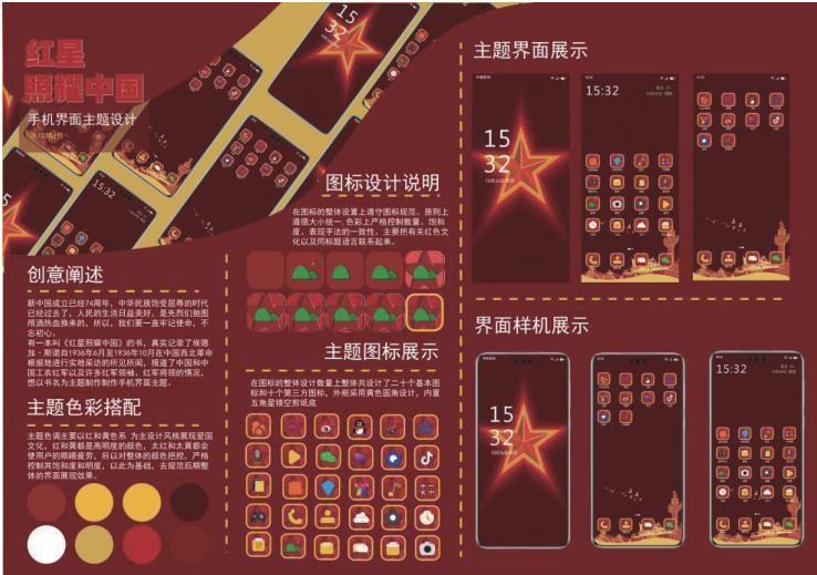 在“图形转化”阶段,重点在于引导学生将红色历史中的符号提炼成视觉元素,重新赋予它们含义,再结合界面的规则,做成一套统一的图标系统和界面风格。这一阶段要兼顾“政治性”和“审美性”,注重红色视觉元素在图形抽象、风格协调、色彩统一时的运用策略。比如,学生作品《红星照耀中国》( 见图 5) 以新中国成立 74 周年为主题,将五角星、礼花、天安门广场等视觉意象整合为主题图标与界面装饰图层。图标形态采用光影渐变手法强化庄严感,色彩以红金为主,营造出有信仰的氛围,形成了有政治文化象征力的视觉系统。