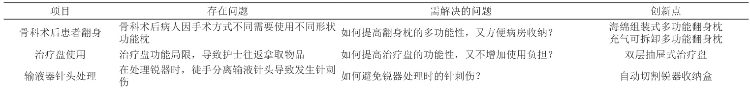 第二步:项目设计 第2 月实践培训中,通过老师抛出问题,启发护生发现临床创新突破口,引导护生思考,并在指导老师的指导下,组长带领队员课后自主查阅文献,构思解决方案。实践项目案例见表2。