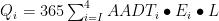 其中,Q 表示某类型排放物的排放量 (σg/ 年),AADT 表示该类机动车每天平均交通量(veh/d),E 表示污染因子 (g/km) ,L 表示行驶距离(km),i 表示车辆类型。计算颗粒物排放因子,公式为: