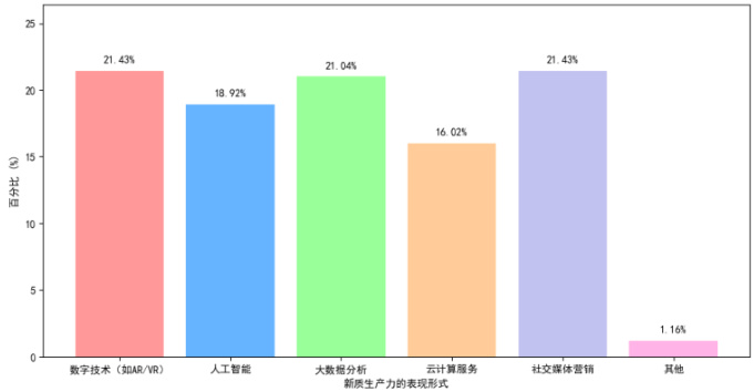 为了全面评估新质生产力在达州文化旅游行业的影响,并探索其发展路径,以推动旅游业的高质量发展,促进文旅融合与创新,增强区域竞争力,并实现可持续发展,通过对达州当地居民、文化旅游行业的从业者、到访的游客、学术界的专家学者,以及其他相关人员的深入调查。结果显示,受访者认为数字技术、社交媒体营销为新质生产力在达州文旅产业中的最主要表现形式,占比 21.43%,其次是大数据分析和人工智能,分别占比 21.04%、18.92%,最后是云计算服务,占比16.02%。