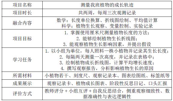 当前基础教育阶段的教学改革不再满足于学科内部知识的机械传授,而是强调在真实情境中整合知识与能力,促进学生的综合素养发展。小学数学作为逻辑性强、结构性严谨的学科,若能与更具实践操作性的科学内容进行融合,便能有效拓展数学知识的实际应用空间。以“测量”为例,数学中的长度单位换算、数据整理与图形表示,与科学中的实验记录、变量控制和观察分析紧密关联,具备较强的交叉融合基础。项目式学习作为一种以问题为导向、以任务为驱动的教学方式,强调知识的整合与学习过程的完整性,适合小学阶段学生的认知特点和学习需求。本文聚焦于“植物生长过程的测量与分析”这一融合主题,设计并实施一套具体的项目式学习活动,探索在真实任务驱动下小学数学与科学融合的有效路径,推动学生在测量、记录、分析、表达等方面的综合能力发展。